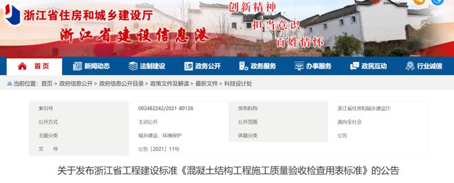 :近日,浙江省住房和城乡建设厅发布《混凝土结构工程施工质量验收检查用表标准》DB33/T1237-2021,自202...